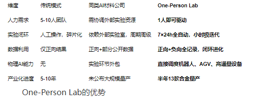 创材深造(Deep Material)是唯一打通"AI设计→自动化实验→数据回流→模型迭代"全闭环并实现规模化量产的中国公司。One-Person Lab在多个维度上展现了中国对美国在该领域的代际超越。