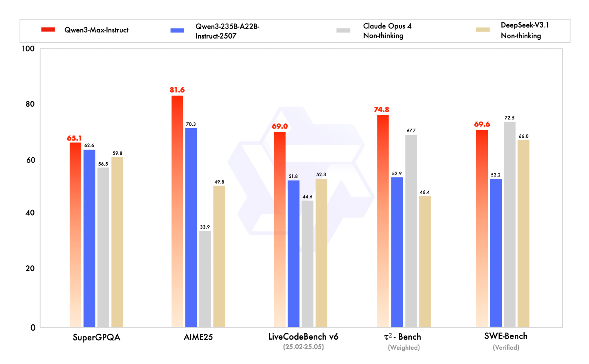 Qwen3-Max为通义千问家族中最大、最强的基础模型。该模型预训练数据量达36T tokens,总参数超过万亿,拥有极强的Coding编程能力和Agent工具调用能力。在大模型用Coding解决真实世界问题的SWE-Bench Verified测试中,Instruct版本斩获69.6分,位列全球第一梯队;在聚焦Agent工具调用能力的Tau2-Bench测试中,Qwen3-Max取得突破性的74.8分,超过Claude Opus4和DeepSeek-V3.1。